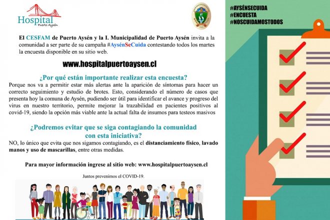 A traves de la campaña denominada “AysénSeCuida”, el CESFAM de Puerto Aysén invita a la comunidad a participar en una encuesta dirigida a todos los habitantes de la comuna, la cual pretende a través de preguntas simples y directas, obtener semanalmente la información necesaria para detectar posibles brotes y cuidarnos entre todos.